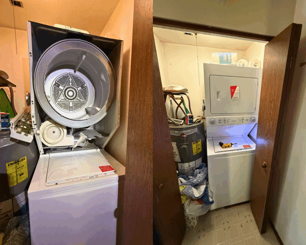 A homeowner contacted us about their Frigidaire stacked washer and dryer unit. The dryer wasn’t heating properly, clothes were still damp at the end of the cycle, and the machine was making unusual noises. Stacked units are convenient but can be challenging to service due to limited space.