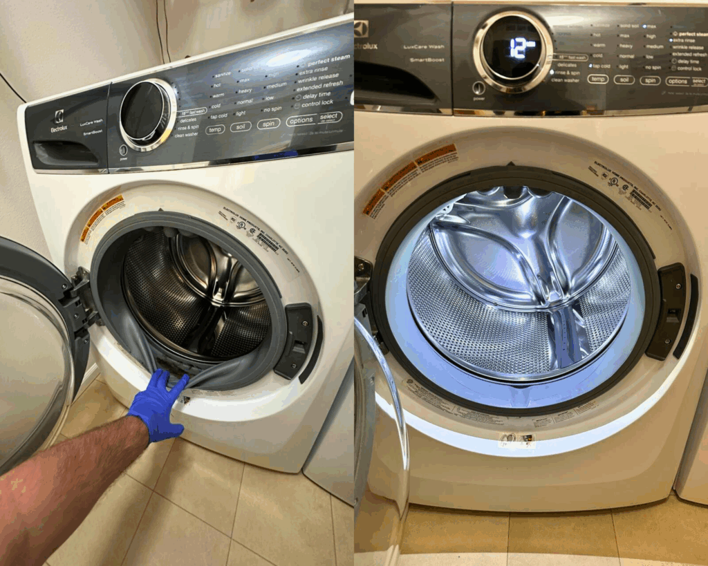 This customer reached out to us because their Electrolux front-load washer was leaking water and the laundry often came out with a musty, unpleasant odor Upon inspection, we found that the door gasket (seal) had mold buildup and small tears, which not only caused water leaks but also trapped moisture that led to the bad smell